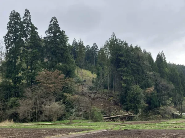 茅葺庵から道を挟んで向かい側にある里山は、能登半島地震と奥能登豪雨で土砂崩れが発生し、里山の入口にある神社のお社も壊れてしまっています。私たちは、この場所で自伐型林業を営むことによって里山を再生させようと思っています。自伐型林業を行うために、まずは山に道をつけるところから始めます。道がなければ、山に入ることができませんし、切った木を搬出することもできません。そのため、今は少しずつ道を作っている状態です。