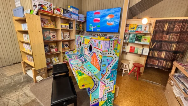 店には「おかえりピアノ」があります。震災で被災した地区のがれきの中から掘り起こした2台のピアノを金沢のアートスタジオに運び、能登から避難していた子どもたちと金沢の子どもたちが一緒に装飾したピアノの内の一台です。