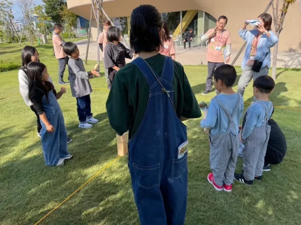 2024年11月には、ダイワハウス工業の招きで奈良県にある『みらい価値共創センター「コトクリエ」』を新村地区の4家族19名で訪問しました。コトクリエは、子どもから大人まで学ぶことができ、住まいの未来について夢を膨らませられる施設で、子どもたちはクイズに答えたりしながら、楽しく住まいの耐震構造や断熱技術、防音の仕組みなどを学びました。