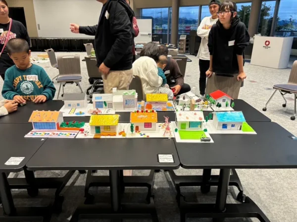未来に住みたいおうちをワークシートにそって書き出す学習では、「寝るとき星空が見えるおうち」「ブランコのあるおうち」「推し活できるおうち」などさまざまなアイデアが出ました。また、模型づくりでは、「あばれ祭り」のキリコがあるおうちを組み立てたりしました。