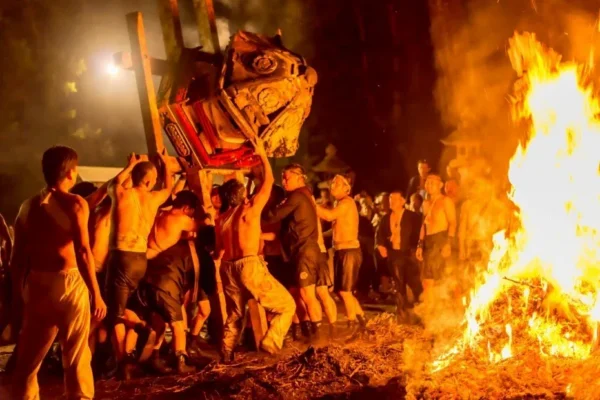 宮入りの前には紫タスキと黄色タスキを掛けた担ぎ手が川に入って神輿を洗い清め、さらに神輿を火の中に投げ入れて、焼き清めることで厄をはらいます。火も水もものともしない勇壮な担ぎ手たちはまさしくヒーローです。
