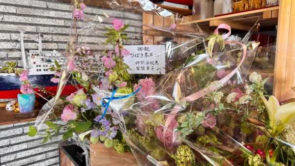 店の一角では、さとみさんの母で女将のさつきさんが、地元の人と談笑する姿が。どこかで見たことのある人だなぁと思っていると、店の壁に女優の常盤貴子さんと撮った写真が飾ってありました。「あの時、テレビに出ていた人だ」とさつきさんとさとみさんを二度見。偶然見たテレビ番組でお二人が常盤さんと話していた場面と重なりました。常盤さんにとっても、つばき茶屋はきっと「『ただいま』と戻ってこられる場所」なのでしょうね。それはさつきさん、さとみさんが積み上げてきた優しさ、思いやりがあるから。そしてこれからもつばき茶屋は、たくさんの訪れる『人と人』をつなげる役割を果たしていくと信じてやみません。