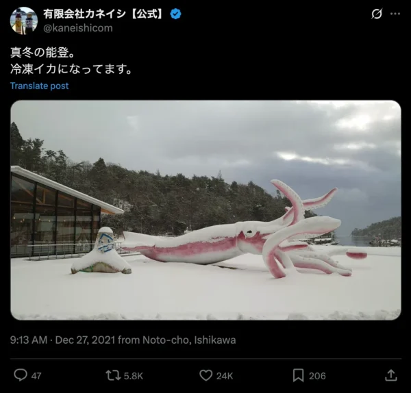 ある冬、イカの上に雪が積もっていたので、スマホで撮った写真を「冷凍イカになってます」とSNSに投稿したら、180万人ぐらいが閲覧し大きな反響もありました。広告代理店の試算によると、その広告効果は数十億円に上るそうです。