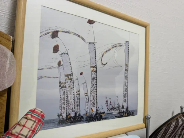 この小木地区は、春と秋に大きな祭りがある地域です。春の祭りは「とも旗祭り」といって、船に高さ20メートルぐらいののぼりを立てて港の中をパレードします。秋には「小木袖ぎりこ祭り」という、キリコを担ぐ祭りがあります。