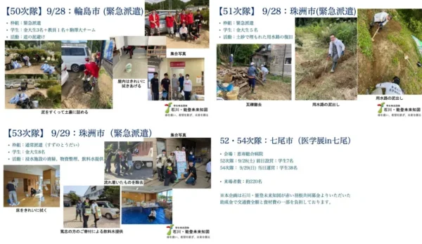 運営スタッフは5〜10名ほど、災害のフェーズや案件に応じてチームを組んで活動を続けてきました。発災直後は金沢からできる情報収集・発信とDMAT(災害派遣医療チーム)の後方支援、現地へ行けるようになった2月中旬頃からは輪島市・珠洲市への学生ボランティア派遣を行い、現在は週1回ペースのボランティア派遣と高校生との協働プロジェクトなど、多岐にわたる支援活動を展開しています。