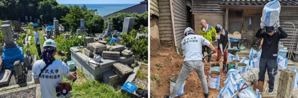主な活動地域は輪島市・珠洲市で、倒壊したブロック塀の撤去、倒壊した墓石や祠の修復、家財道具の搬出、瓦拾い、黒島天領祭や雪割草まつりなどのお祭りの運営補助、子どもたちの遊び相手などを行ってきました。2025年6月21日現在で通算102回、のべ532名の大学生・高校生のボランティアを派遣。今後も継続していきたいと考えています。
