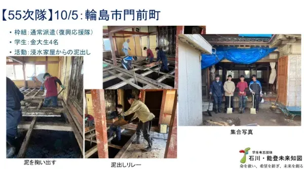 9月22日にも珠洲市での医学展を予定していましたが、その前日に奥能登豪雨が発生。開催は見送りとなり、「石川・能登未来知図」は珠洲市と輪島市への学生ボランティアの緊急派遣を行い、被害を受けた家屋や商店の泥出し活動に切り替えました。このとき僕らがすぐに動けたのは、豪雨の前から組織を立ち上げて活動し、地域や支援団体の皆さんとのつながりができていたから。平時からの備え、継続的な活動の重要性を感じました。