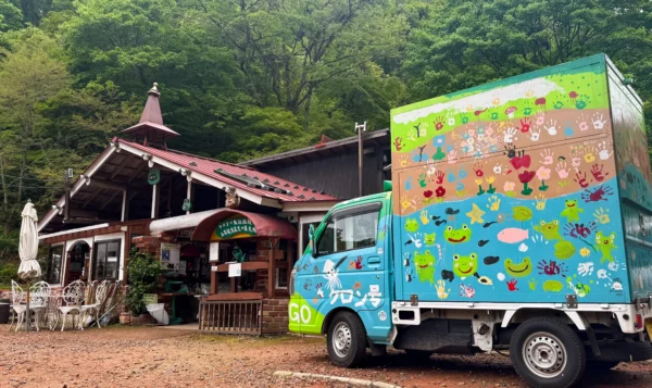 外部のイベント等に出店する際に活躍している移動販売車“ケロン号”に出会えるのを、取材前より楽しみにしていました。ここ数年、全国的にキッチンカーや移動販売車は増加しましたが、すべて自分たちの手で車体にイラストを記載したものは、見たことがありませんでした。