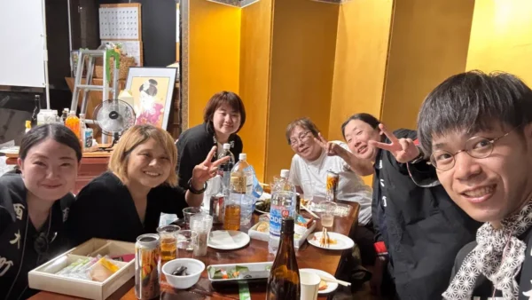 あっという間に私の目の前に、ビールや日本酒、お茶、さまざまな料理やお菓子などが並びました。そして人が増えるたびに「乾杯!」を繰り返すのです。