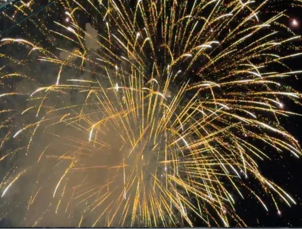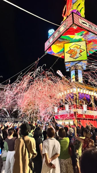 そして、パーンという音が鳴り響き、クラッカーから色とりどりの紙吹雪が宙に舞うと同時に、 8町会の人たちが燈籠山から伸びたロープを引き、大きな燈籠山が左右に揺れながら春日神社に向かって動き出します。その後ろの「榊神輿」、 8基の曳山(山車)が、笛や太鼓、大きな掛け声と共に春日神社へ戻ったのは、23時を回っていました。