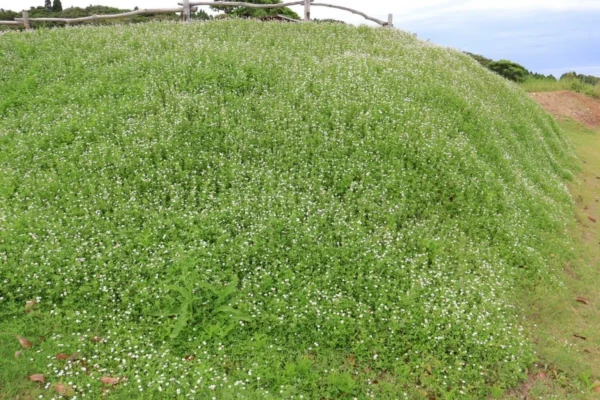 キャンプ場のおすすめの場所を葉子さんに聞くと、「ここから見える景色はもちろんおすすめなのだけど、この白い小さな花がかわいいんですよ」と教えてくれました。この花は地盤を強くする役割もあるそうです。可憐な小さい花と海と風を感じました。