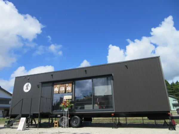 トレーラーハウスを選んだ最大のポイントは、デザイン性の高さだけでなく、他所で建設してから松波に移設できることにありました。奥能登で建設する場合と比べると時間もコストも大幅に軽減でき、仮設なので大規模な地盤改良も必要ありません。将来新たな施設を建てる場合は、移動して別用途で活用することも可能です。
