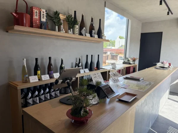 店内は往時の酒蔵を彷彿とさせる落ち着いたグレーを基調とし、カウンター後ろの大きな窓からは松波の風景がよく見えます。店内にイスはありませんが、試飲しながらお客様と談笑できる、ほどよい高さのカウンターを設置。ご近所の方はもちろん、県外からのお客様も気軽に立ち寄れる場所であってほしい、という思いが伝わります。