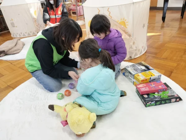 たとえば、避難場所には子どもの遊び場がありません。子どもにとっては、遊べない、疲れない、眠れないというサイクルが生まれ、生活リズムが不規則になってしまいます。また保護者の方は、家の復旧作業をしようにも幼い子どもがいると作業に集中できません。そのような状況がわかり、避難所のなかに子どもの居場所「みんなのこども部屋」をつくりました。