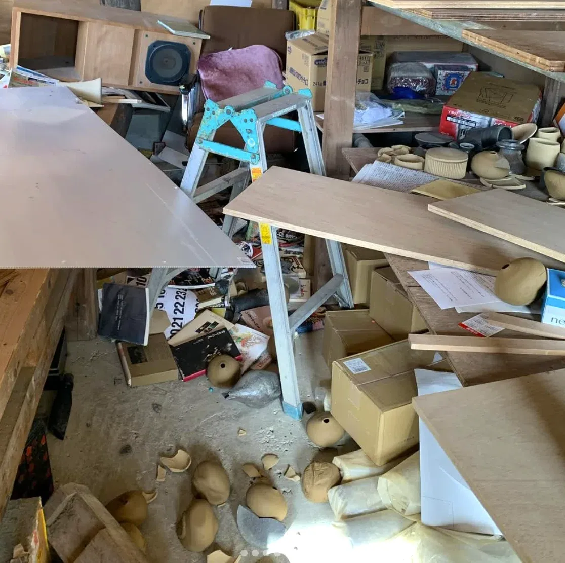 元日の地震で制作途中の作品などが壊れた篠原さんの工房(撮影:2024年1月5日 舟見有加さん提供)