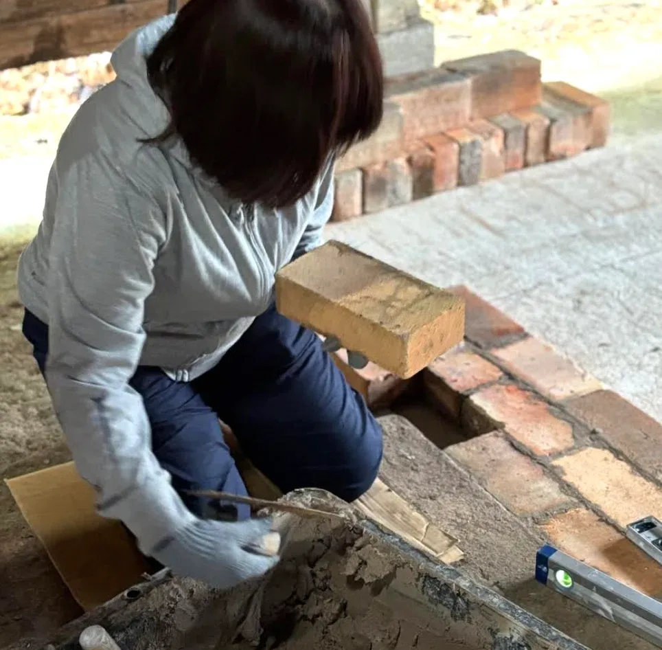 工房で崩れた窯のレンガを積み直すボランティアの女性(撮影:2025年4月25日 舟見有加さん提供)